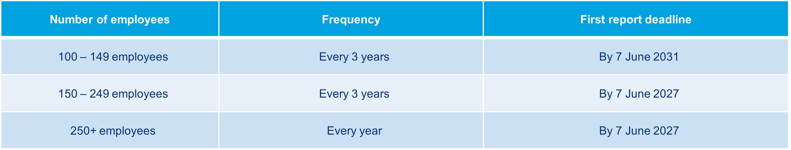 The frequency of the reporting and the first report deadline is dependent on the number of employees in the organization. The following timelines apply: