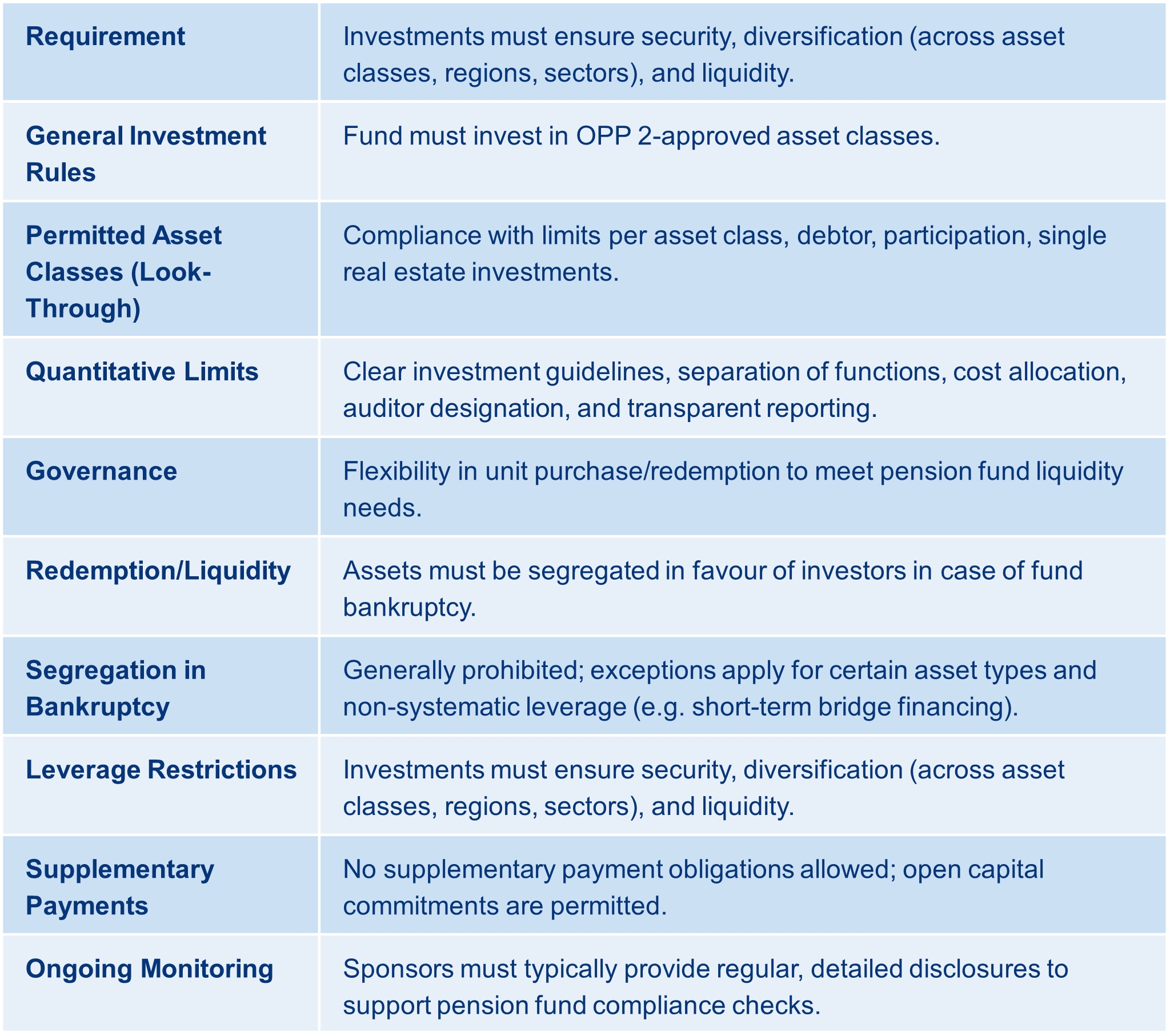 As mentioned above, OPP 2 sets out certain requirements that organisation of investment funds need to meet so that pension funds are permitted to invest in such funds.