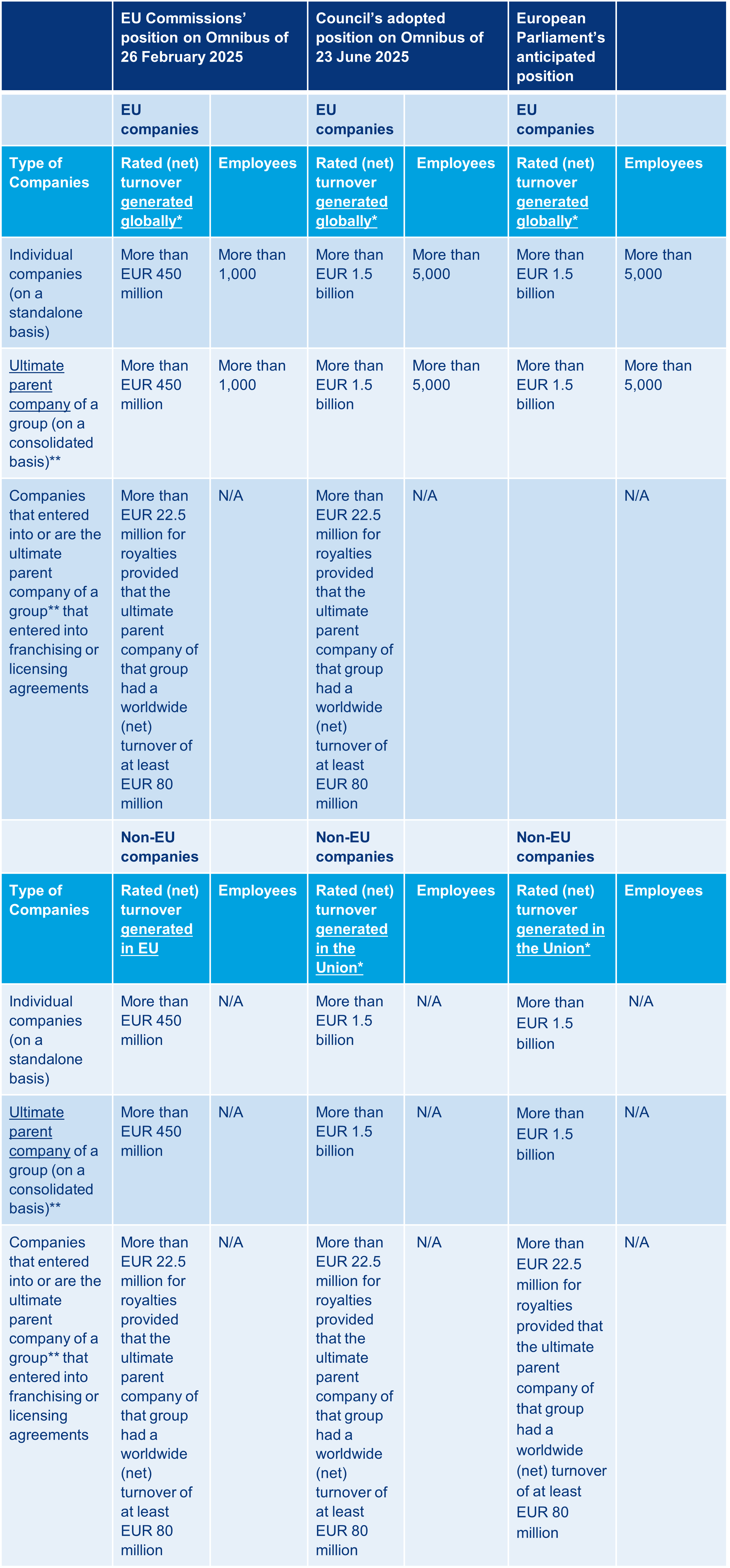 The EU Commission proposed not to amend the current thresholds under the CSDDD to be considered in-scope. The Council’s Final Position, however, includes raised thresholds and therefore a (further) reduced scope of the CSDDD. The European Parliament aligns with this position by supporting the increased thresholds proposed by the Council, thereby agreeing to a further narrowing of the CSDDD’s scope.